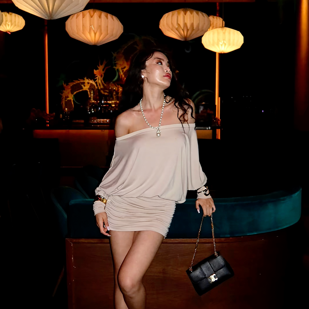 Glow Mini Dress is designed to fall effortlessly off your shoulders, giving that relaxed “I didn’t even try” hotness. The draped batwing sleeves and stretchy mini skirt blend comfort with pure feminine energy.